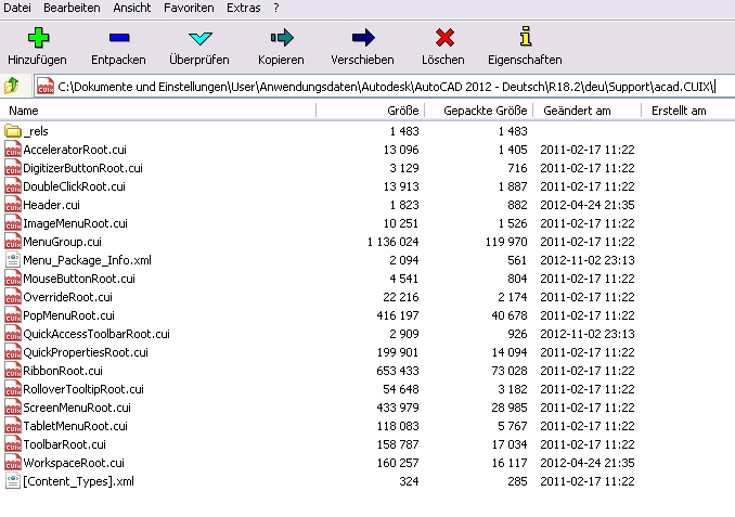Der Inhalt dieses Archivs besteht unter anderem aus CUI-Dateien für alle Abschnitte der AutoCAD-Benutzeranpassungen. Und so gibt es auch eine Datei namens „QuickAccessToolbarRoot.cui“! Diese Datei sollte jetzt entpackt werden.